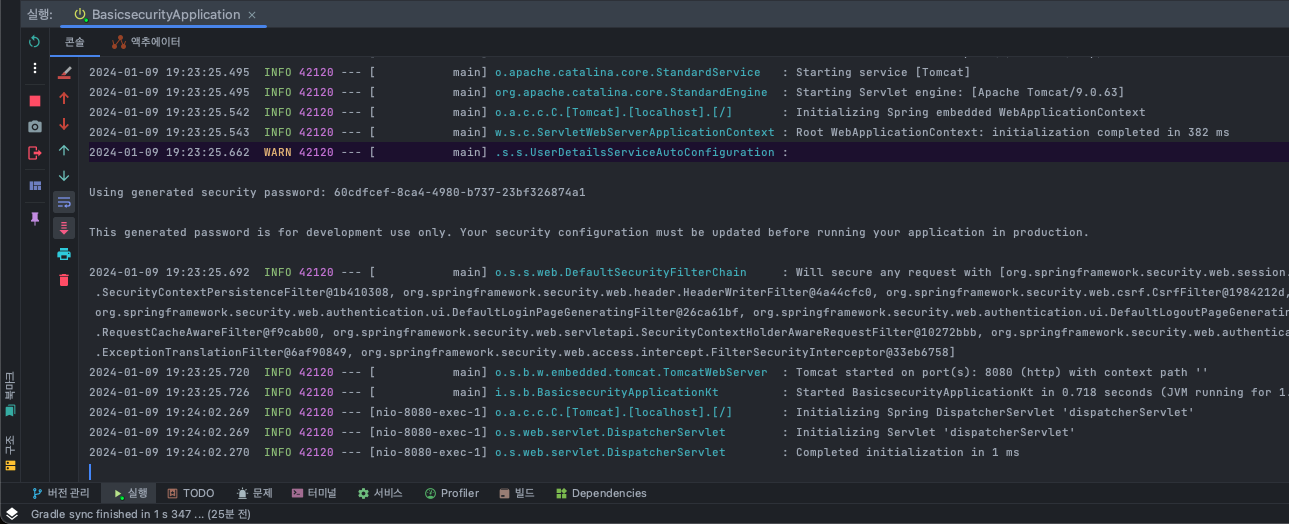 import org.jetbrains.kotlin.gradle.tasks.KotlinCompile plugins { id("org.springframework.boot") version "2.7.0" id("io.spring.dependency-management") version "1.1.4" kotlin("jvm") version "1.9.21" kotlin("plugin.spring") version "1.9.21" } group = "io.security" version = "0.0.1-SNAPSHOT" java { sourceCompatibility = JavaVersion.VERSION_11 } repositories { mavenCentral() } dependencies { implementation("org.springframework.boot:spring-boot-starter-web") implementation("com.fasterxml.jackson.module:jackson-module-kotlin") implementation("org.jetbrains.kotlin:kotlin-reflect") implementation("org.springframework.boot:spring-boot-starter-security") //์คํ๋ง ์ํ๋ฆฌํฐ ์์กด์ฑ ์ฃผ์ ! testImplementation("org.springframework.boot:spring-boot-starter-test") } tasks.withType<KotlinCompile> { kotlinOptions { freeCompilerArgs += "-Xjsr305=strict" jvmTarget = "11" } } tasks.withType<Test> { useJUnitPlatform() }dependencies ๋ถ๋ถ์ implementation("org.springframework.boot:spring-boot-starter-security") ๋ฅผ ์ถ๊ฐ ํ gradle๋ฅผ ๋ค์ ๋ก๋ํ๊ณ ์คํํด ๋ณด๊ฒ ์ต๋๋ค.